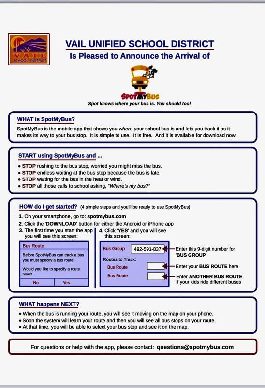 The Vail School District (VUSD) is excited to announce a new partnership with SpotMyBus. SpotMyBus is a GPS tracker that is now installed in every VUSD bus.