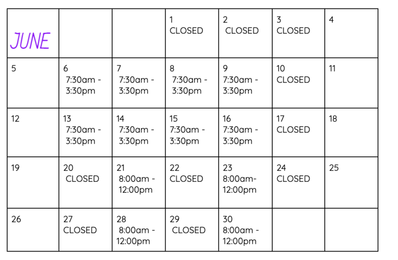 Our hours vary over the summer. Please preview the calendar below to see when we are open!